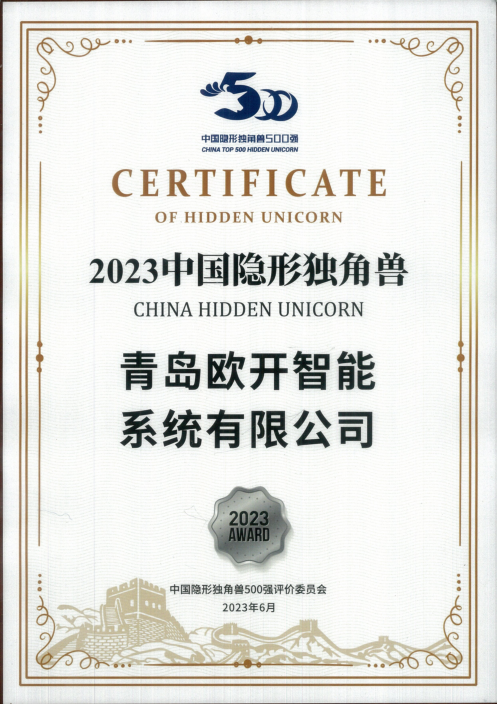 歐開(kāi)智能2023中國隱形獨角獸企業(yè)證書(shū)